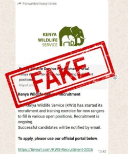 The Kenya Wildlife Service (KWS) has issued a public warning over a fake recruitment link circulating online and on social media platforms, cautioning Kenyans against falling victim to fraudsters posing as the agency.